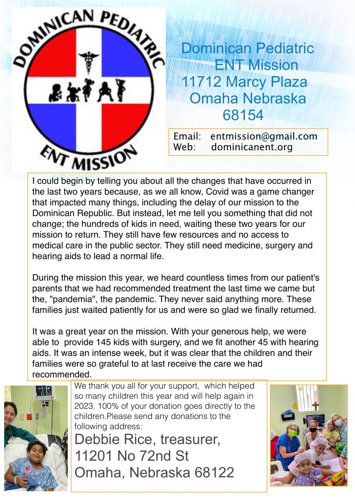 Providence has allowed us another year to bring life changing care to children in the Dominican Republic. These children do not have access to important services such as hearing testing and the fitting of a hearing aid. This care allows them to resume their education and gives them an avenue to join the Dominican society as a productive and accomplished person. Without this help, they struggle in school and their chances of success are so diminished. And the rewards are so heartwarming to help a bright but hearing impaired child fulfill their dreams.